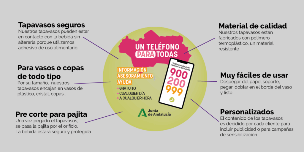 Nuestros tapavasos son adhesivos, funcionan como un precinto de seguridad para prevenir la sumisión química y las agresiones sexistas y son un excelente soporte para campañas de publicidad y sensibilización